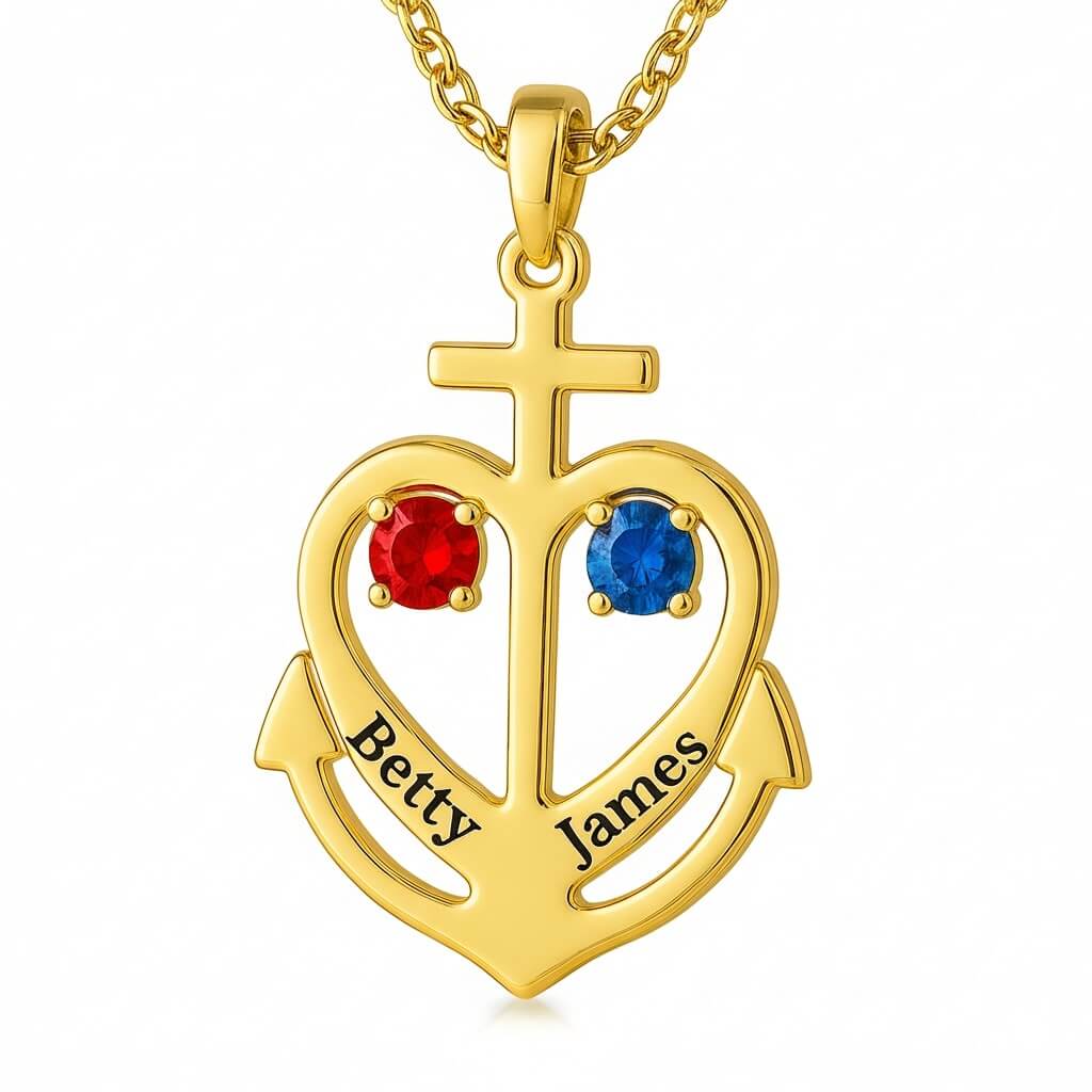 Crafted in 18K gold-plated sterling silver, the pendant features a mirror-polish high-gloss finish that radiates a warm, luxurious shine. The two vivid birthstones—customizable to represent your loved ones—add a meaningful, personal touch, while the engraved names make it a one-of-a-kind keepsake.